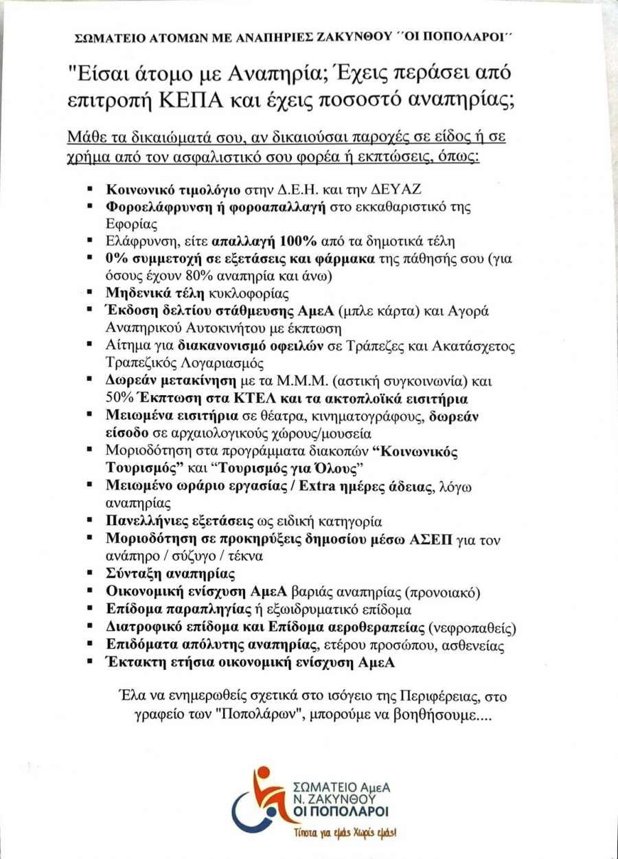 Το Σωματείο ΑμεΑ ν. Ζακύνθου "ΟΙ ΠΟΠΟΛΑΡΟΙ" ανακοινώνει ότι, στα πλαίσια της αρτιότερης ενημέρωσης των μελών του αλλά και του αναπηρικού κινήματος εν γένει, έχει αναρτήσει πληρέστατο κατάλογο των δικαιωμάτων/παροχών σε είδος ή χρήμα στις Δημόσιες Υπηρεσίες που χρησιμοποιούν κατά κόρον τα ΑμεΑ στην καθημερινότητά τους.
